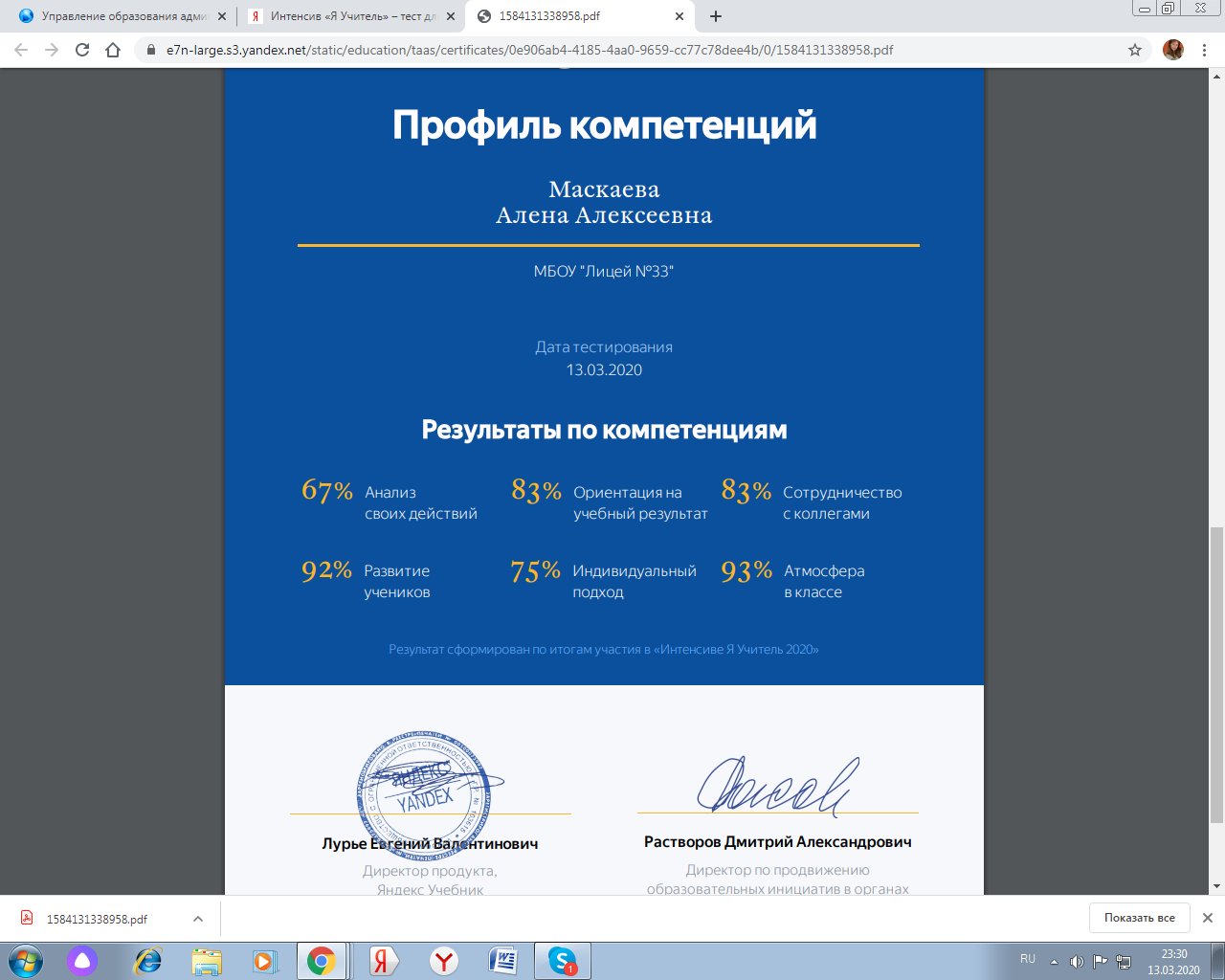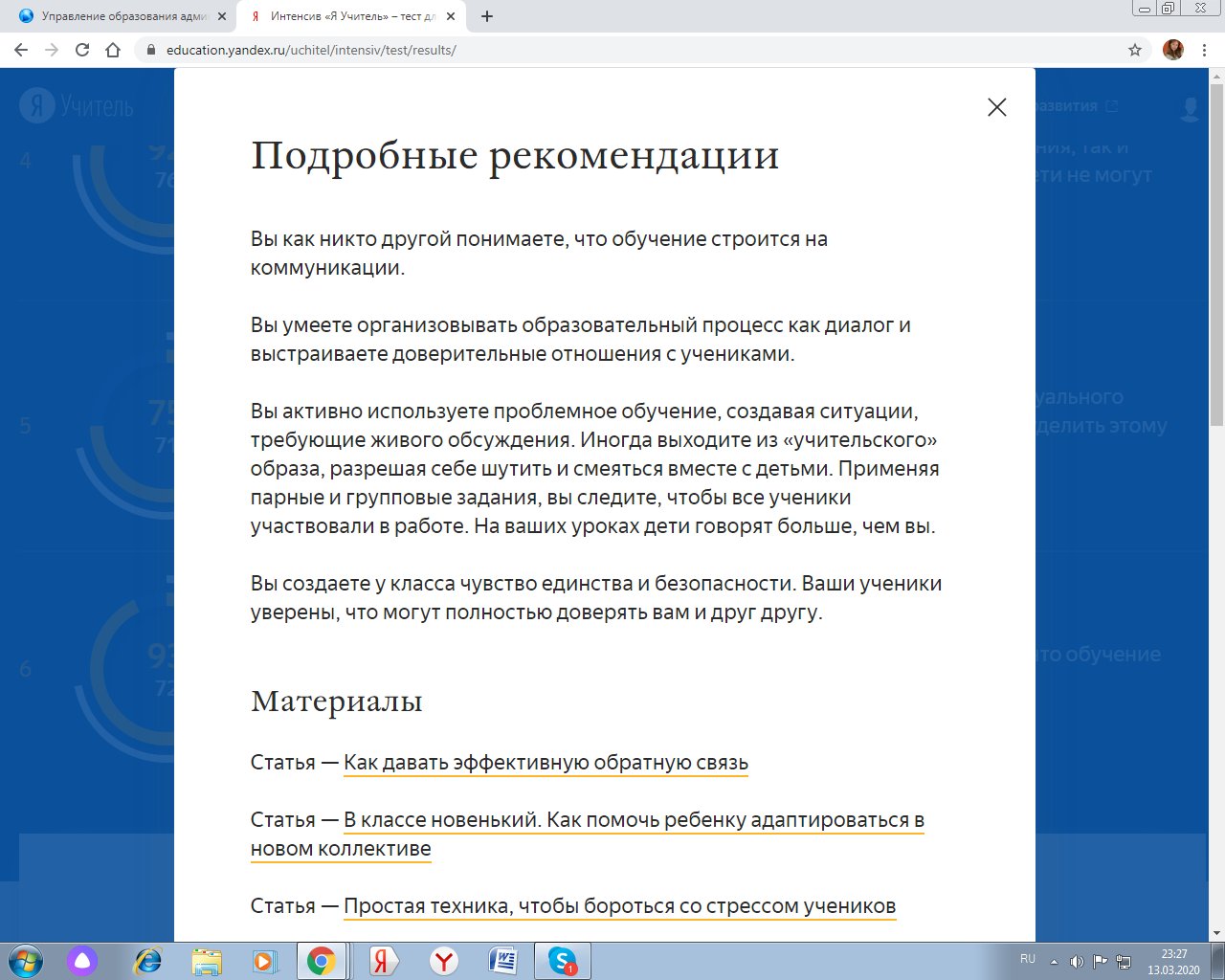 Платформы «Яндекс.Учебник» и «Я Учитель» с 10 марта по 11 апреля 2020 года для школьных учителей и преподавателей всех уровней образования проводят интенсив «Я Учитель». Это бесплатное онлайн-тестирование для педагогов, которое даст им возможность больше узнать о своих гибких навыках и понять, какие профессиональные компетенции помогут дальше развиваться и повышать квалификацию.